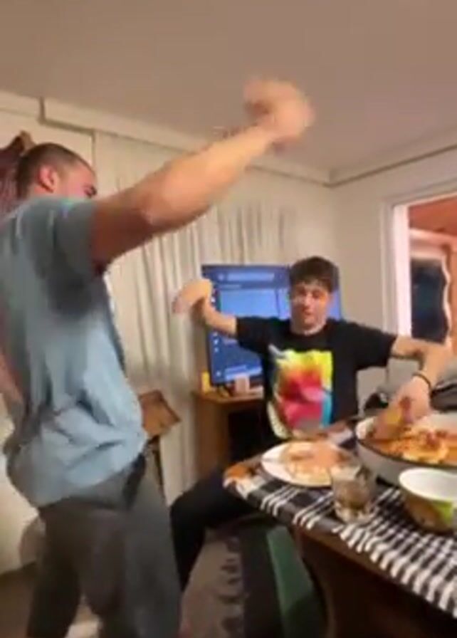 Two males are dancing in a room, near a table that has food items on it. One male is standing up, wearing a blue shirt and grey pants, and he is flailing his arms in the air. The second male is sitting down, wearing a black shirt with a colorful design, black pants, and slides that are yellow, pink, and green. The sitting male is also waving his arms. There are plates of food, a glass of liquid, and a bowl on the table. Behind the males is a TV on a stand, and the room has tan walls and white trim.