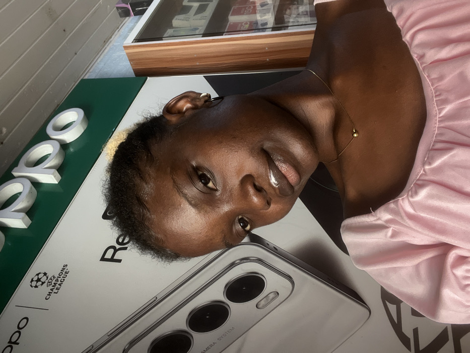A young female subject with dark skin is captured in a close-up portrait within a mobile phone retail store in Kubwa, Nigeria