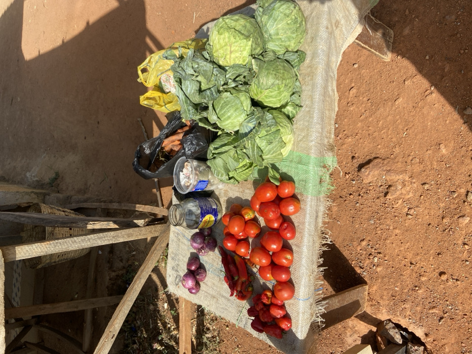 The image depicts an outdoor market stall, likely located in a residential or commercial area of Jos, Nigeria. The ground beneath and around the stall is reddish-brown earth, consistent with laterite soil common in the region, suggesting an unpaved outdoor setting under direct sunlight. A rustic, elevated table, constructed from rough-hewn wooden supports, is covered with a light-colored, possibly jute or polypropylene, woven sack material that serves as a display surface. Scattered across this surface are various fresh vegetables arranged for sale. From left to right on the table: * Approximately ten reddish-purple onions are grouped on the upper left. * Below the onions are two distinct piles of red peppers: a larger cluster of long, slender red chili peppers and a smaller cluster of rounder, brighter red peppers (possibly Scotch bonnets). * To the right of the peppers, a substantial mound of red tomatoes is visible, comprising approximately 20-25 individual fruits. * Further to the right, occupying a significant portion of the table, is a large collection of green cabbages, numbering around ten to twelve heads. Other items on the table include: * A clear glass jar with a blue and yellow label, positioned above the tomatoes. * A small, clear plastic container with a blue label, filled with white items, possibly garlic cloves, next to the glass jar. * A black plastic bag containing orange carrots is situated behind the small plastic container and cabbages. * Two crumpled yellow plastic shopping bags are partially visible behind the cabbages, possibly holding additional produce. The background reveals more wooden structures, possibly parts of other stalls or a simple shelter, and more reddish-brown earth. No individuals are visible in the frame, indicating the stall is either unattended at the moment or the perspective is focused solely on the produce display. The scene is brightly lit by natural sunlight, casting clear shadows on the ground.