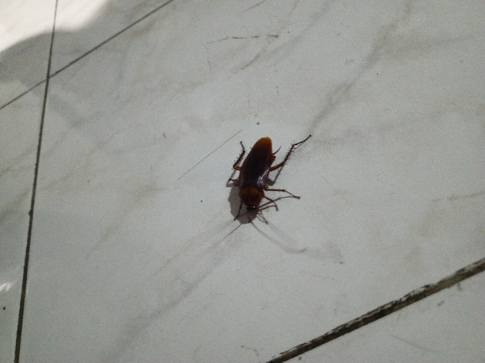 - "A dark reddish-brown cockroach, approximately 3-4 cm in length, is depicted lying inverted on a light-colored ceramic tiled floor" by FM-SYIBA3, licensed under CC BY 4.0