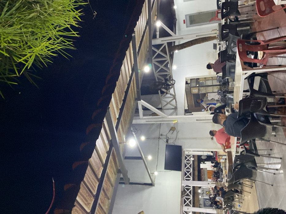 An outdoor restaurant with white structural supports is visible. Diners are seated at tables, mostly in dark chairs. A large television hangs on the wall. A palm tree trunk passes through the structure. A dark sky and some green foliage are seen at the edges of the frame. The image appears to be rotated.