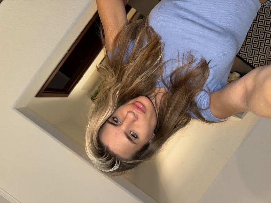 An individual female with long, wavy brown hair and prominent blonde highlights is depicted in a selfie, taken from a slightly low angle