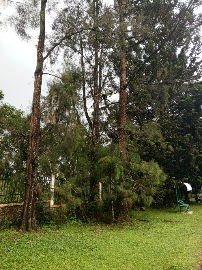 The image depicts a grassy park area with tall, thin trees dominating the scene. These trees have sparse foliage and a somewhat barren appearance. A fence and stone wall are partially visible in the mid-ground. To the right, a green park bench with a partial covering sits amidst denser trees and greenery. The sky is overcast, contributing to a subdued atmosphere.