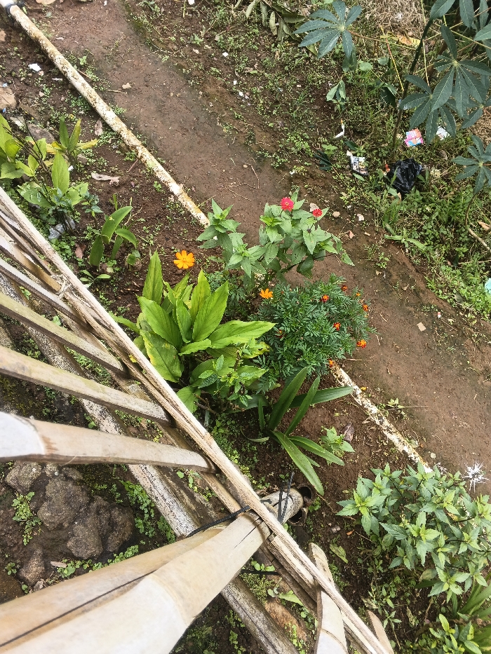 An elevated view captures a garden bed next to a bamboo fence. A narrow dirt path separates the garden from dense vegetation. The garden contains plants with large, vibrant green leaves, marigolds with orange blossoms, and zinnias displaying red and orange flowers. Litter is visible among the greenery beyond the path. A white pipe runs alongside the path's edge, marking the boundary between the cultivated area and the wilder growth.