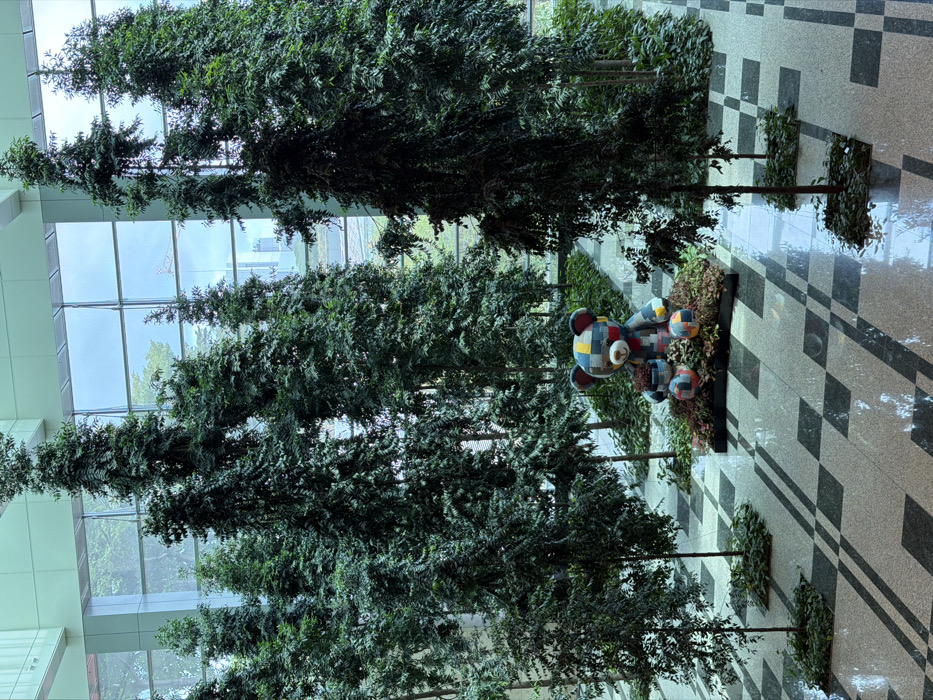 A view from above reveals a tiled floor with dark diagonal stripes, punctuated by rows of trees. The trees are dense, with dark green leaves, and the top branches reach the ceiling with glass windows. In the center, a vibrant, patchwork-patterned bear statue sits surrounded by greenery, adding a touch of whimsy to the space.