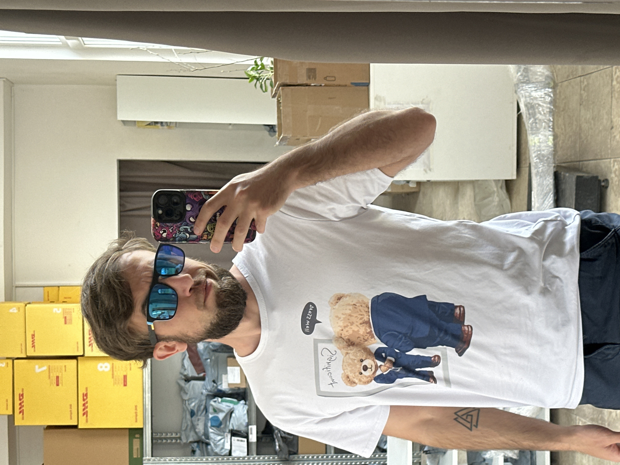 A bearded man is taking a selfie in a mirror. He wears blue sunglasses and a white t-shirt with an image of two teddy bears in suits. The man holds a smartphone with a patterned case. Behind him are several stacks of DHL boxes. A metal shelving unit is also visible, holding stacks of packages in plastic bags. The environment suggests a shipping or warehouse setting. The location in Polski Trambesh, Bulgaria is not verifiable from the image.