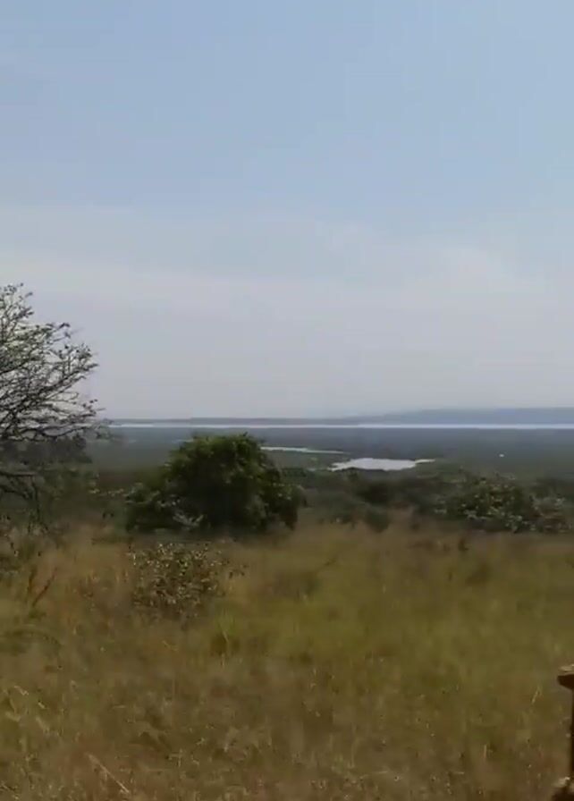 landscape view from a moving vehicle. The foreground is filled with tall, dry grass and interspersed with green bushes and trees. In the distance, a large body of water extends to the horizon, with hints of land or islands within it. The sky is a light blue with a faint haze near the horizon. The camera's viewpoint is slightly obstructed by the frame of the vehicle. The overall impression is of a scenic view observed during travel through a rural or natural area.