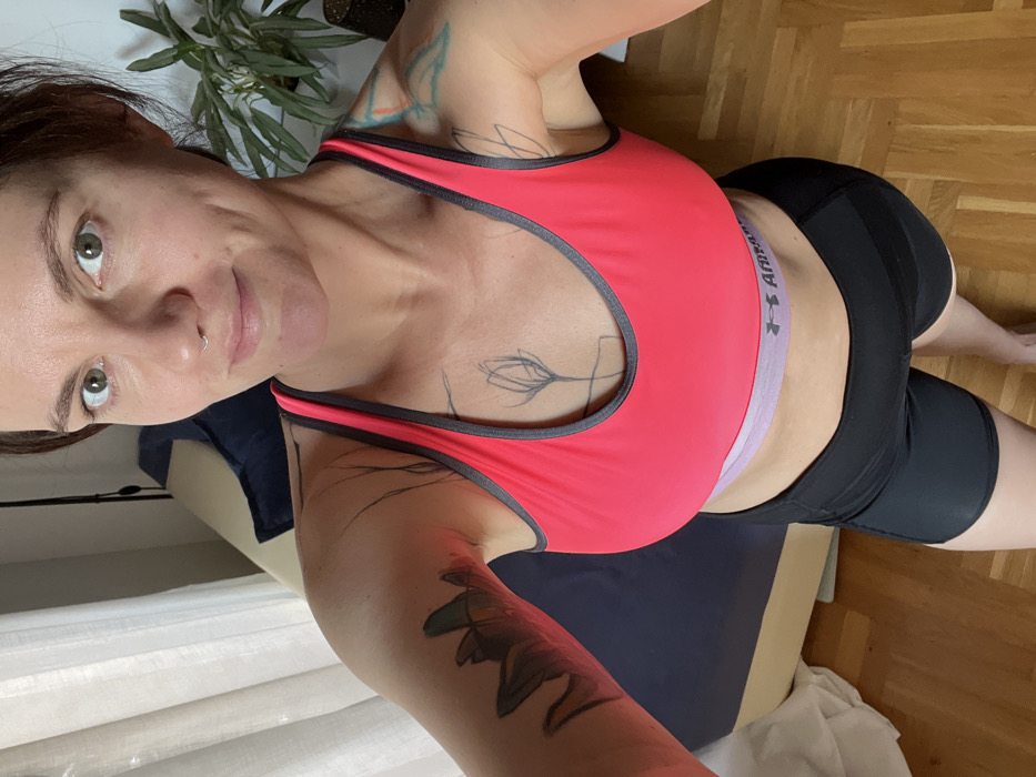An adult female is depicted in an indoor setting with light brown parquet flooring, identified as Boreti, Montenegro. She has fair skin, short brown hair, and green eyes, with a silver nose ring in her left nostril. She is looking directly at the camera with a slight smile. She wears a coral-pink sports bra with grey trim, a light purple band showing the "Under Armour" logo beneath it, and black athletic shorts. She is barefoot. Visible tattoos include a colorful floral design on her upper left arm, a black outline plant-like design on her sternum, and a faint blue/teal design on her right shoulder. In the background to her left, sheer white curtains cover a window, alongside a light-colored examination or massage table covered with a dark blue sheet and cushion. A dark, slender stand is also partially visible. To her right, a green potted plant in a dark pot is positioned against a white wall.