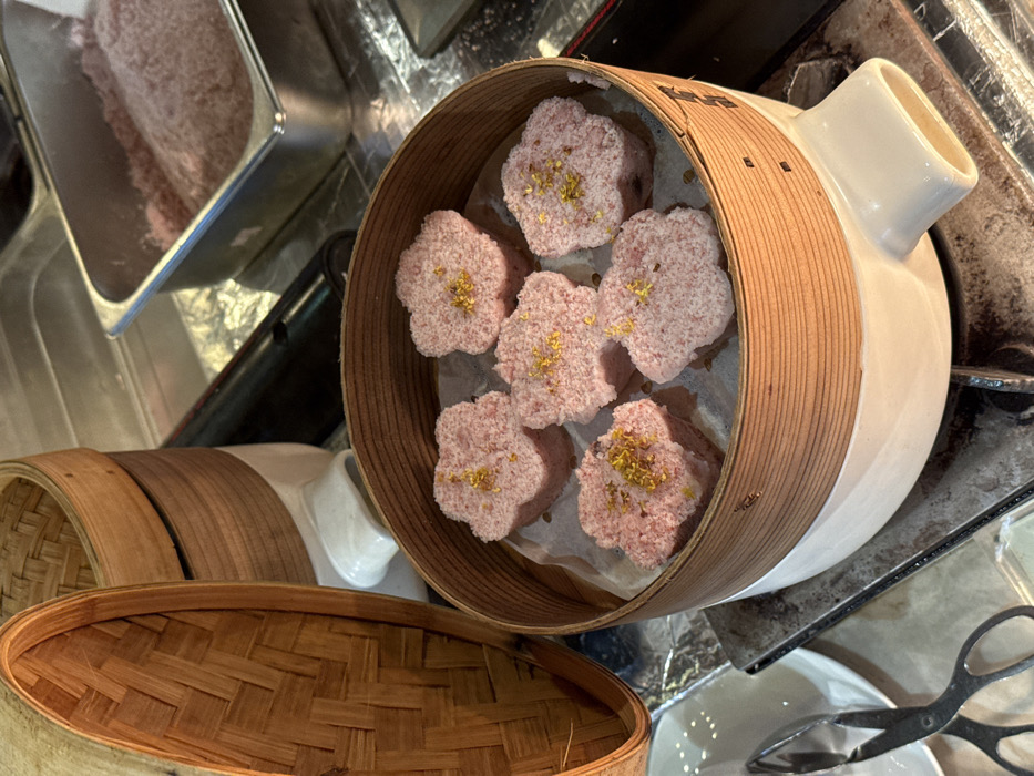 - "Six pink, flower-shaped steamed cakes are displayed within a light brown bamboo steamer, which rests on a white ceramic base with an integrated spout, on a metallic surface in Tongxiang, China" by FM-kiqHy2, licensed under CC BY 4.0