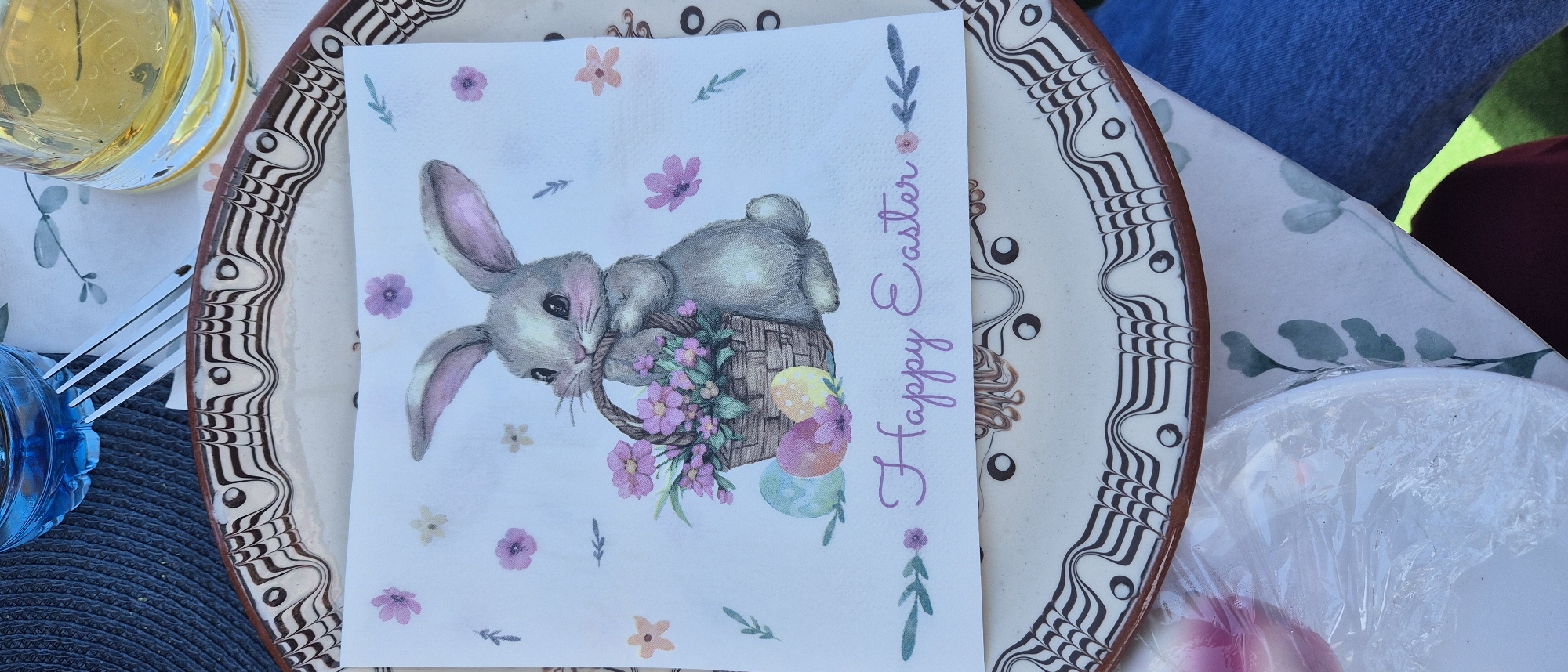 The image depicts a table setting, likely outdoors, in Stamboliyski, Bulgaria. A plate with a decorative patterned edge holds a paper napkin with a print of a bunny in a basket of flowers and Easter eggs, accompanied by the words "Happy Easter." A fork and a glass of yellow liquid are visible on the left side of the plate. Another plate wrapped in plastic is on the right side of the plate. Parts of people are visible with the blue of jeans on the top of the image and the red of a shirt on the right. The table is covered with a cloth bearing a leaf pattern.