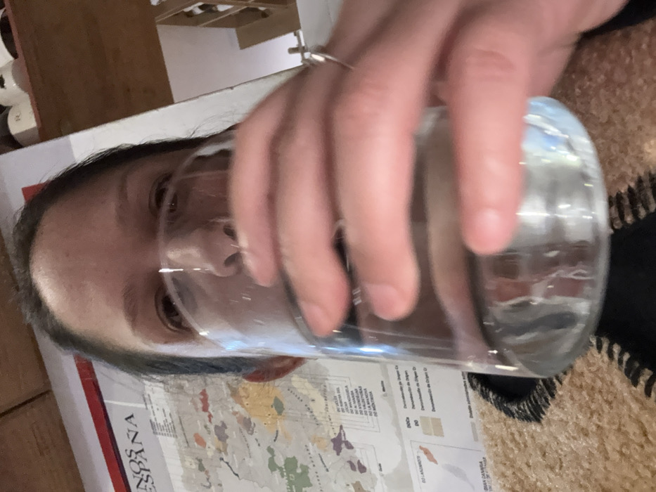An individual holds a glass of water in front of their face, distorting their features through the glass. A simple silver ring adorns one finger. The subject appears to be positioned above a map, perhaps a guide to Spain. A portion of a patterned brown and black sweater is visible in the periphery. The background hints at a room with other furniture.