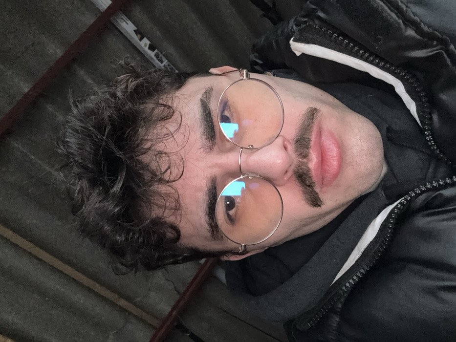 A low-angle selfie features a man with curly dark hair, wearing round glasses and a fake mustache