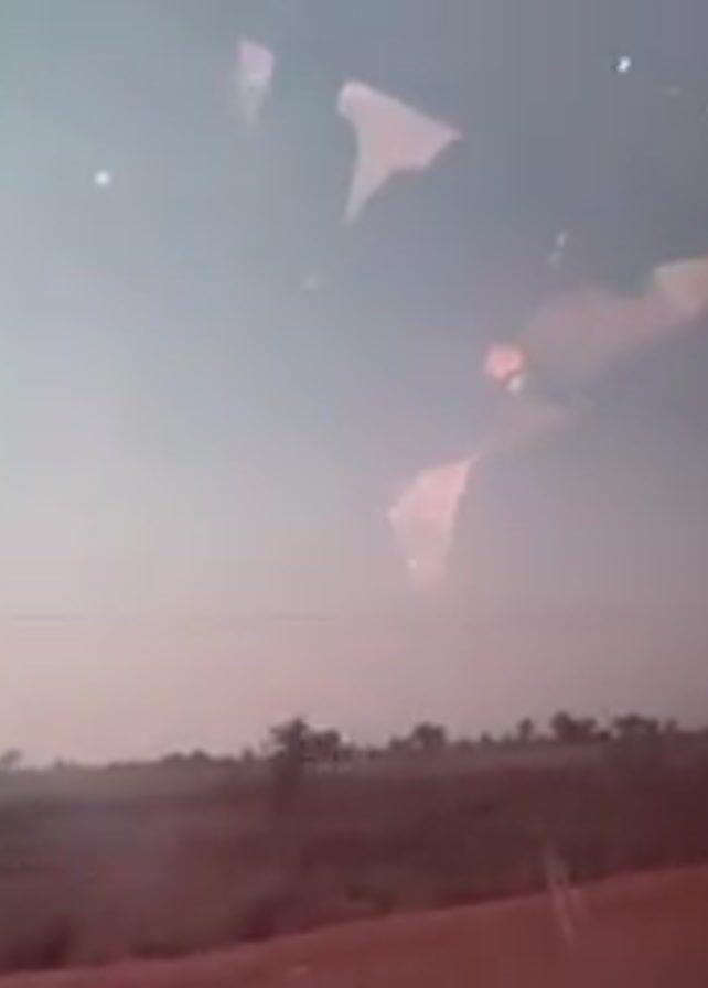 The view from inside a moving vehicle shows a rural landscape through the window. The landscape appears dry and dusty, with sparse vegetation and telephone poles lining the roadside. There are people walking along the side of the road. The sky is hazy and the overall lighting suggests either early morning or late afternoon. The reflection in the window partially obscures the outside view, but it shows the interior of the vehicle and the people within. The camera seems to be held by someone inside the vehicle, capturing the passing scene.
