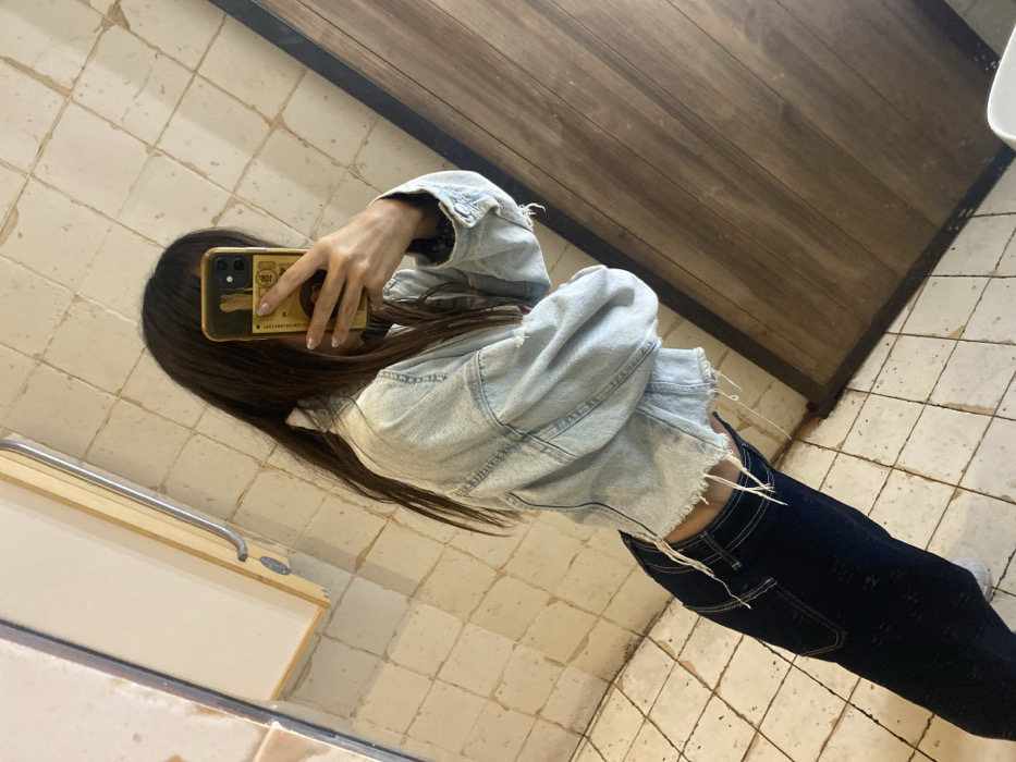 A person with long, dark hair, wearing a light blue distressed denim jacket with frayed edges and dark blue jeans, is captured taking a mirror selfie