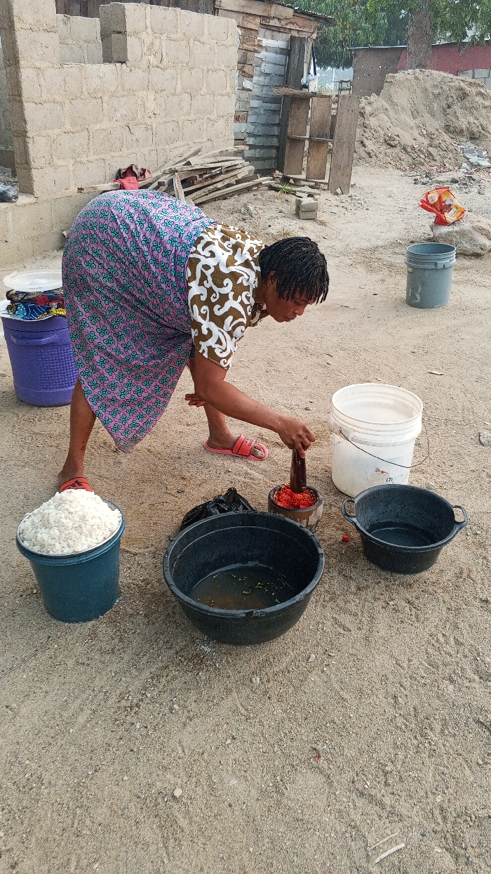 A woman in a patterned dress and sandals leans over a collection of buckets and bowls on a dirt ground. She is using a mortar and pestle to grind red peppers. A bucket filled with white rice sits to her left. Two black bowls contain water, while a white bucket stands nearby. A purple bucket with items sits in the background. The scene appears to be outdoors, with a partially constructed building and a pile of sand visible in the background.