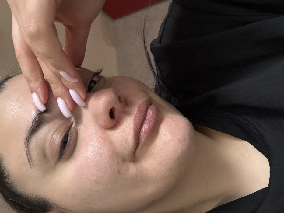 The image is a close-up, chest-up portrait of a single individual, a female, presenting her upper torso and face. The location is stated to be Sofia, Bulgaria. The subject is a woman with fair skin, dark eyebrows, and dark hair pulled back from her face. She is wearing a plain black t-shirt. Her left hand is raised to her face, with the fingertips of her index, middle, and ring fingers resting on her forehead above her left eyebrow. Her nails are manicured with a light pink or nude polish, and are of medium length with an almond or oval shape. Her left eye is partially closed, looking downwards, while her right eye is mostly obscured by her hand and eyelid. Her lips are slightly parted, forming a subtle pout or downward curve. Her skin exhibits visible pores and minor blemishes. The background is out of focus, indicating a shallow depth of field. To the left, a blurry light brown or beige surface is visible, possibly a wall or furniture. To the right, a blurred dark red or burgundy mass is present, consistent with an indoor setting. There are no identifiable landmarks or objects in the background to confirm the specific city location of Sofia, Bulgaria; this detail is provided by the prompt. The lighting is soft and appears to be artificial or indirect.
