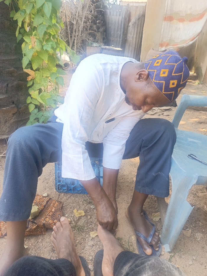 The scene depicts an outdoor setting in Akwanga, Nigeria. An adult male is situated in the midground, crouched or seated on a blue plastic crate. He wears a white long-sleeved shirt, dark blue trousers, and a blue skullcap with yellow geometric patterns. His right foot is shod in a dark blue flip-flop. He is actively engaged in handling the left foot of an unseen individual, whose bare lower legs and feet are visible in the foreground. This individual also wears dark trousers. Adjacent to the male, on his right, is a light blue plastic chair with a metallic utensil, possibly a spoon or knife, resting on its seat. A folded piece of patterned fabric (orange, brown, and black) is on the ground near the bare feet. The ground is composed of reddish-brown earth with scattered dry grass and small plant matter. In the background, a dark brick structure partially covered by green climbing vegetation is visible on the left, transitioning to dry brush, a corrugated metal fence, and a light-colored building under daylight conditions on the right.