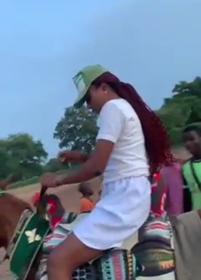 A woman with red braids rides a brown horse in a dirt field. She is wearing a white t-shirt and shorts, a green hat, and white sneakers. The horse is adorned with colorful fabric and tassels. Several people stand around watching her. The sky is overcast. Trees and buildings are visible in the background.