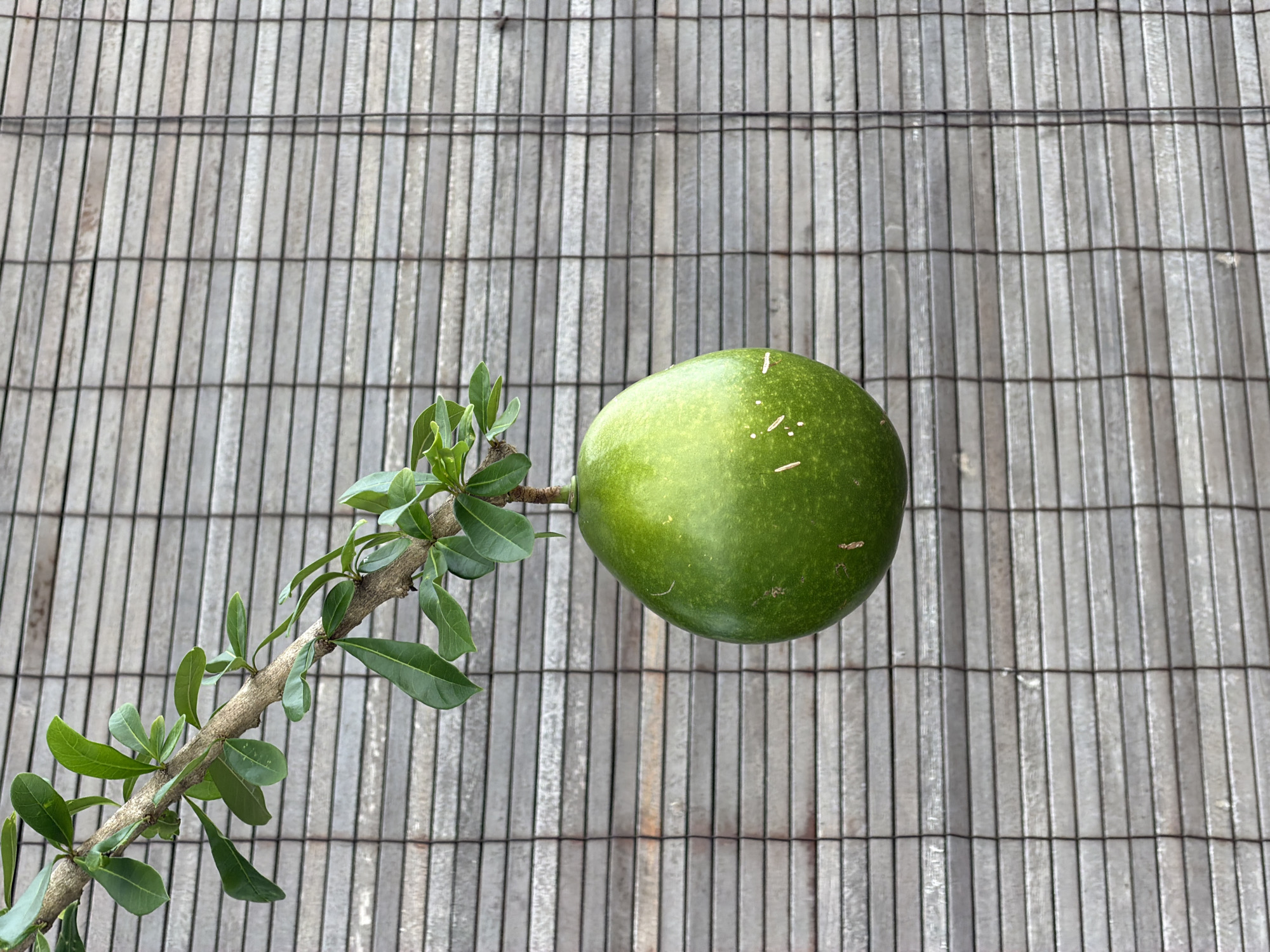 - "A single, unblemished, spherical green fruit, approximately 15-20 cm in diameter, hangs from a brown, leafy branch extending diagonally from the upper left quadrant of the frame" by FM-3GCI23, licensed under CC BY 4.0