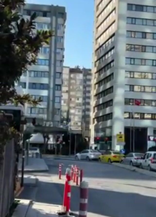The video captures a street scene in an urban area. Several high-rise buildings are visible, including a taller building with a sign that reads "ISTANBUL". Cars, including a yellow taxi, are parked on the side of the road and waiting at a red traffic light. Red and white traffic cones and poles are arranged along the sidewalk. A tree is visible in the foreground. The weather appears sunny and the sky is clear.