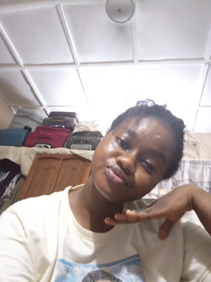 A young woman with dark hair and skin poses for a selfie. She wears a light-colored t-shirt with a graphic print and rests her hand on her neck. The background includes a white paneled ceiling with a light fixture, a wooden cabinet, and several suitcases stacked on top. A sheer white curtain hangs slightly visible. The angle of the shot is from below, tilted upwards.