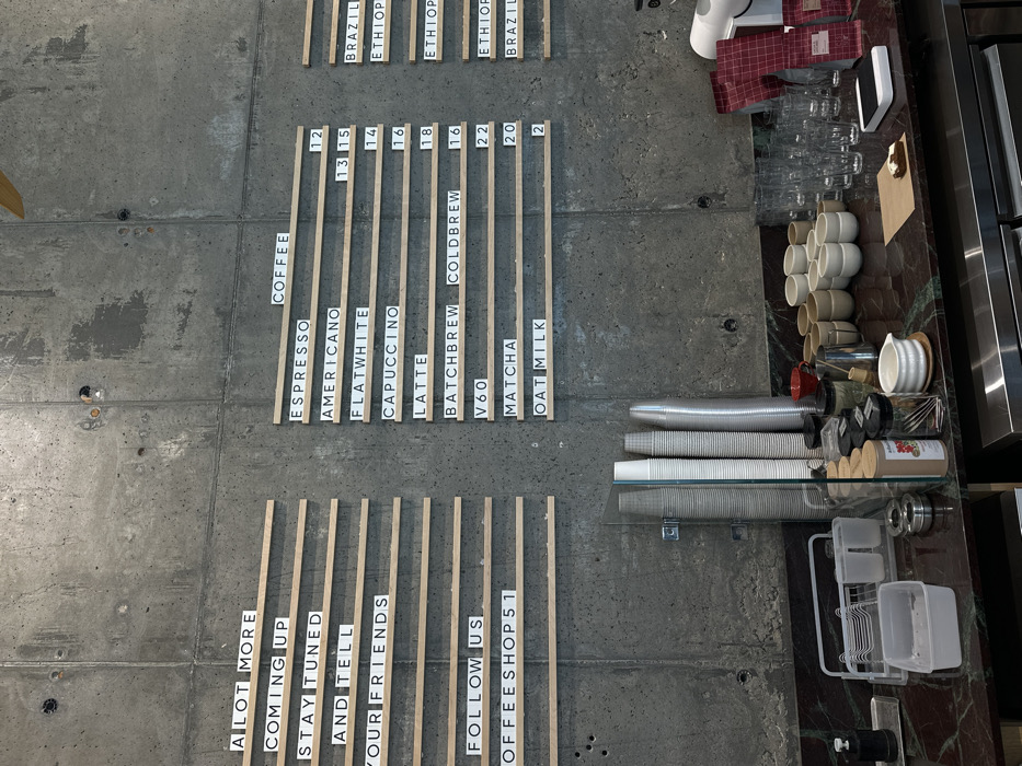 A concrete wall displays a coffee menu with prices and coffee bean origins. The menu offers espresso ($12), americano ($13-15), flat white ($14), cappuccino ($16), latte ($18), batch brew and cold brew ($16), V60 ($22), matcha ($20), and oat milk ($2). Coffee beans come from Brazil and Ethiopia. A second section encourages customers with "A lot more coming up, stay tuned and tell our friends, follow us @offeeshop51." Cups, lids, and other coffee-making accessories are visible on a counter to the right.