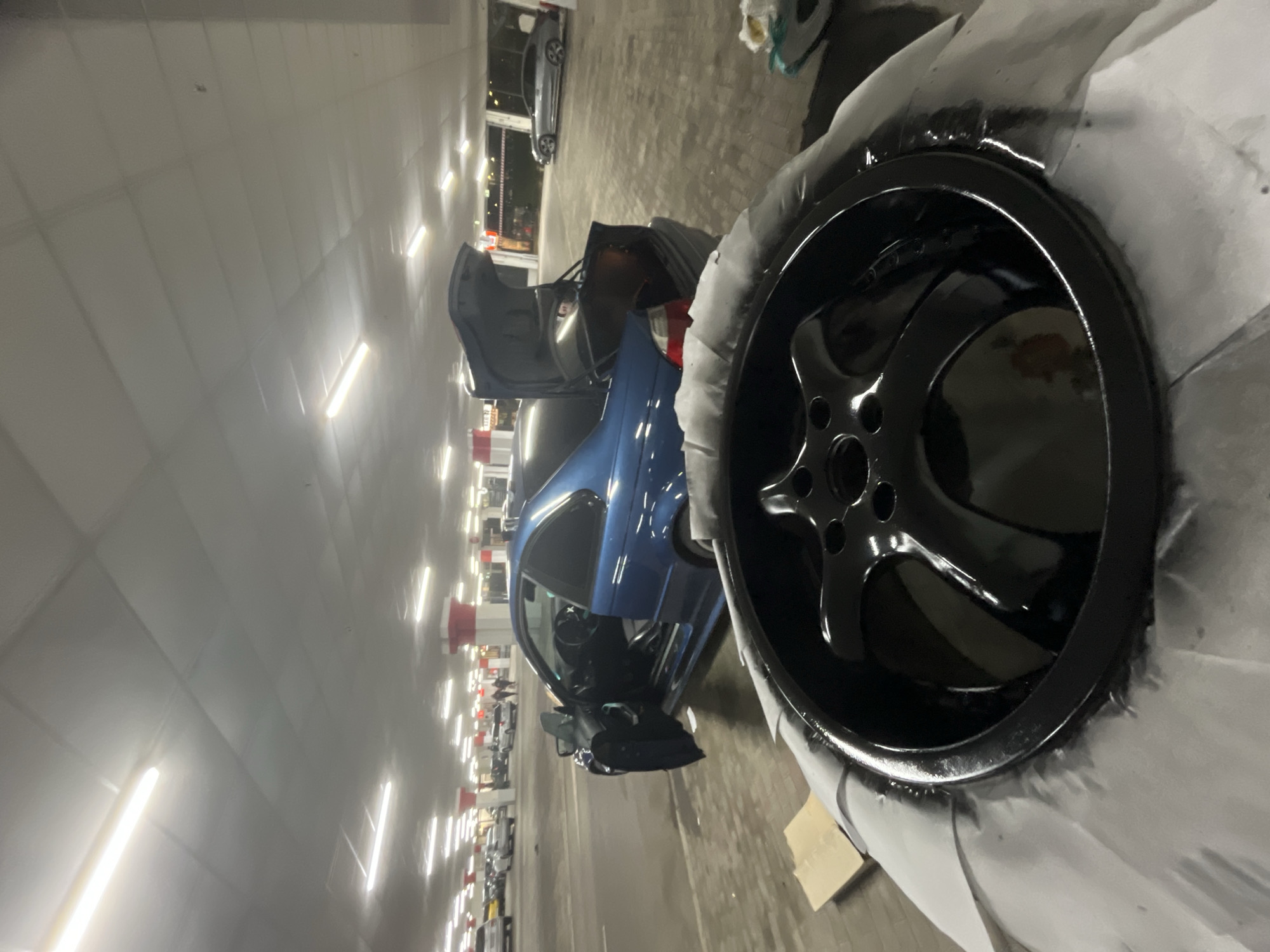 interior of a parking garage, likely indoors due to the artificial lighting consisting of rows of fluorescent lights. A blue BMW coupe is parked with its hood and passenger door open. A recently painted, glossy black car wheel is the foreground subject, positioned to the right of the frame. The wheel is partially wrapped in white paper, probably to prevent overspray. The scene suggests auto maintenance or customization is in progress. Given the description requirements, it is not possible to factually determine if this location is Varna, Bulgaria without explicit visual confirmation.