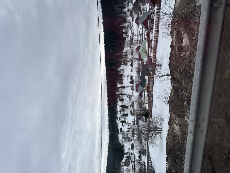 The image displays a wide, elevated exterior view of a snow-covered village, identified as Усьва, Russia, under an overcast sky. In the immediate foreground, a metallic, light grey guardrail runs horizontally across the bottom section, featuring visible bolts connecting its segments. Directly behind and below this guardrail are irregular mounds of dark, dirty snow and exposed earth, indicating a partially melted ground surface. The midground features the village, spread across a landscape blanketed in white snow. Numerous single to two-story houses are scattered across gentle slopes. The houses display various exterior colors, including muted reds, greens, and browns, with predominantly dark or grey roofs. Many properties are delineated by wooden picket fences. Bare deciduous trees and shrubs are interspersed among the residences and open snowy areas. No individuals are discernible within the village scene. The background consists of a dense forest composed primarily of dark coniferous trees, covering a hill or mountain range that rises behind the village, forming a thick, dark green and brown horizon. The sky occupies the upper portion of the frame, uniformly overcast and grey, indicating diffused light conditions. A single dark, thin wire, consistent with a power or utility line, traverses horizontally across the upper mid-section of the sky, just above the distant tree line.