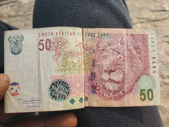 - "A South African fifty rand note, folded in the middle, features a lion's head on the right half and various security features on the left" by FM-EmtoE3, licensed under CC BY 4.0