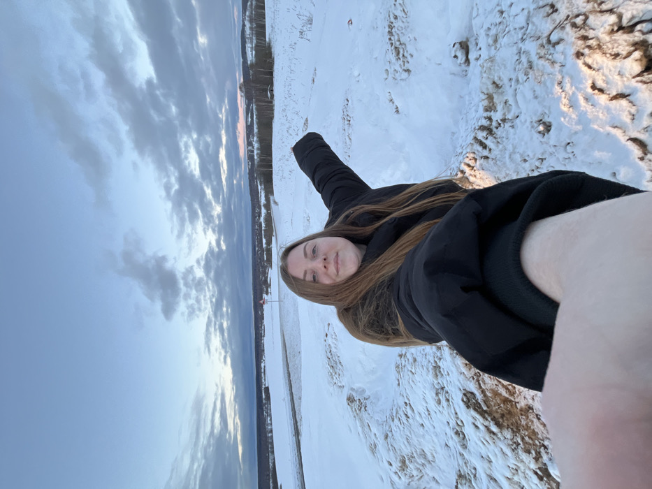 A female individual is depicted in a selfie, positioned on a snow-covered, uneven embankment in what is described as Zubovo, Russia