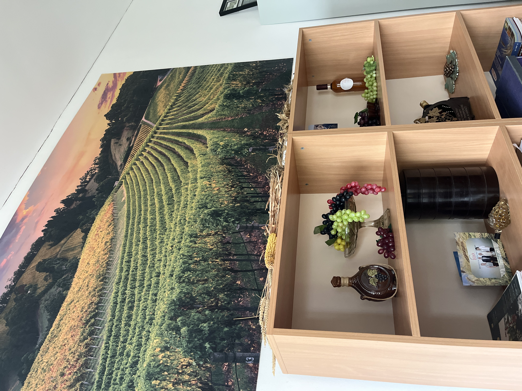 The image displays an interior room, likely an office or reception area in Karnobat, Bulgaria, characterized by viticulture and winemaking themes