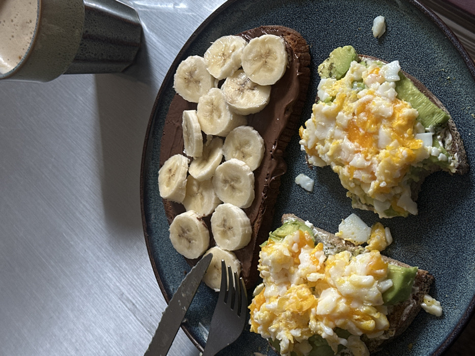 This image depicts a meal served on a textured dark blue-green ceramic plate, situated on a light grey, horizontally-brushed surface, likely a table, within a location in Saint-Ouen-sur-Seine, France. The plate holds three distinct items of food. In the upper portion, a piece of dark, rectangular bread is spread with a dark brown substance, likely chocolate or hazelnut spread, and topped uniformly with numerous slices of banana. To the lower left and right, two smaller pieces of dark, triangular bread are each topped with slices of green avocado and a substantial amount of chopped hard-boiled egg, consisting of both white and yellow portions. The piece on the lower right exhibits a crescent-shaped bite mark. Scattered on the plate are a few small fragments of the egg mixture. A silver-colored fork and knife with dark handles rest diagonally on the upper left edge of the plate, with their tines and blade tip extending over the banana-topped bread. In the upper right corner of the frame, a segment of a vertical, ribbed, two-tone ceramic mug (light beige/brown top, grey bottom) is visible, containing a light brown beverage topped with a layer of foam. No individuals are present in the image. Shadows suggest illumination from the left.