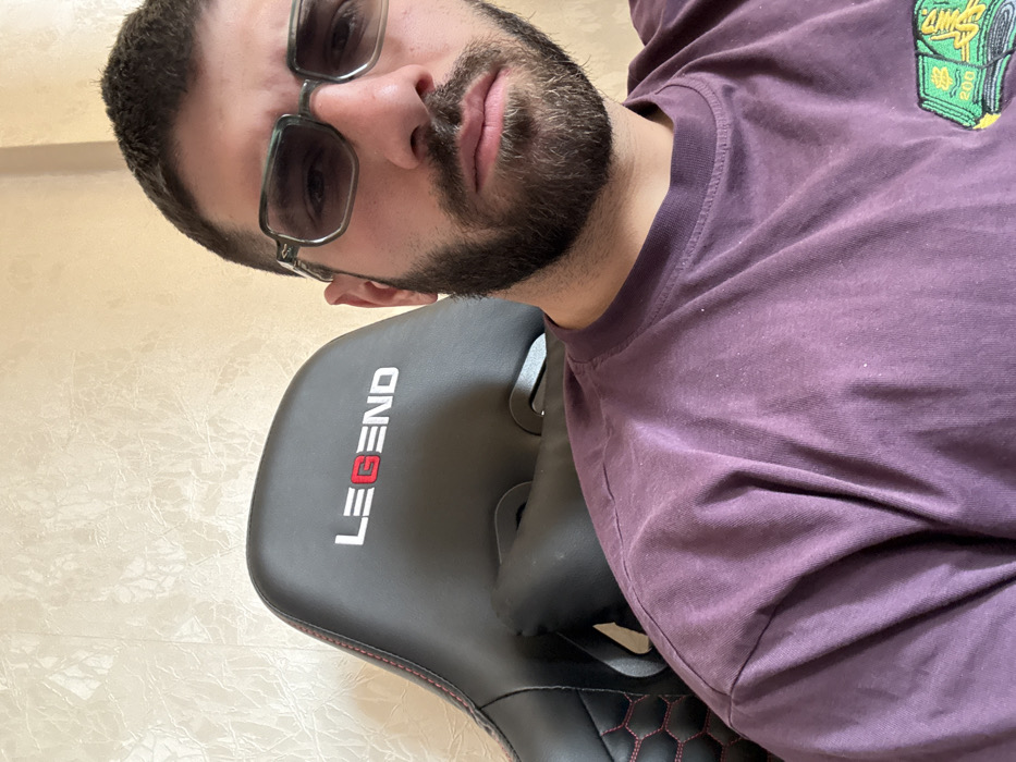 A male individual with short dark hair and a full dark beard is depicted in an indoor setting in Sofia, Bulgaria. He is wearing square-framed glasses with tinted lenses and a plum-colored short-sleeved t-shirt. The t-shirt features a graphic on the lower right, depicting stacks of green currency with yellow accents, including a visible "200" denomination. Behind the individual is the upper portion of a black gaming chair, featuring red stitching and the embroidered word "LEGEND" in white with a prominent red 'G'. The background consists of a light beige wall with a subtle textured finish. The subject is looking directly forward.