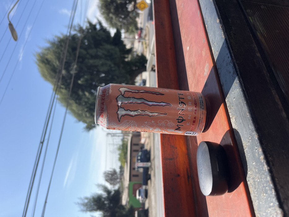 The image depicts an outdoor daytime scene in Arica, Chile, observed from a slightly elevated vantage point. In the immediate foreground, resting on a two-tiered surface comprising an upper reddish-orange metal plate and a lower dark, textured material, are two items: a black, oval-shaped "Redmi" earbud charging case on the left, and a 473 mL orange-pink "Monster Energy Ultra Peachy Keen" can, labeled "SIN AZÚCAR," positioned upright to its right. Both items cast distinct shadows from direct sunlight. The midground reveals a blurred street scene with multiple vehicles, including a light-colored sedan and a dark blue pickup truck. Across the street, low-rise buildings are visible, one featuring a green facade. The background consists of a clear blue sky, bisected by overhead utility lines, with a street lamp fixture visible on the upper right. Various trees with green foliage are scattered throughout the midground and background. No individuals are visible in the scene.