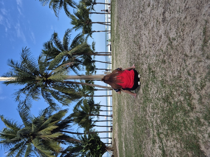 The image captures a coastal scene in An Hải Ward, Vietnam. A person with long, light brown hair in a bun is centrally positioned in the foreground, facing away from the camera, in a low squat or seated posture on a sandy area interspersed with sparse green grass. This individual wears a red short-sleeved top with dark trim and dark pants; white sandals are placed on the ground behind their bare feet. Beyond this foreground, a distinct line of numerous tall palm trees runs horizontally across the midground. The background reveals a calm blue ocean under a clear sky with scattered wispy clouds. Several indistinct human figures are visible on the distant beach or in the shallow water, indicating other presences in the environment.