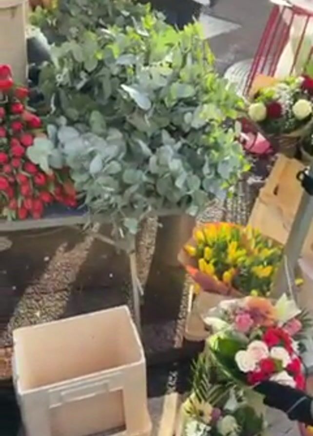 flower stand at a market. Bunches of flowers are arranged, including tulips in various colors such as red, yellow, pink and white. There are also bunches of yellow mimosa flowers and eucalyptus branches. A person can be seen standing behind the flower display. Several crates are visible, some containing pre-made bouquets. The ground is brick. The scene appears to be outdoors on a sunny day.