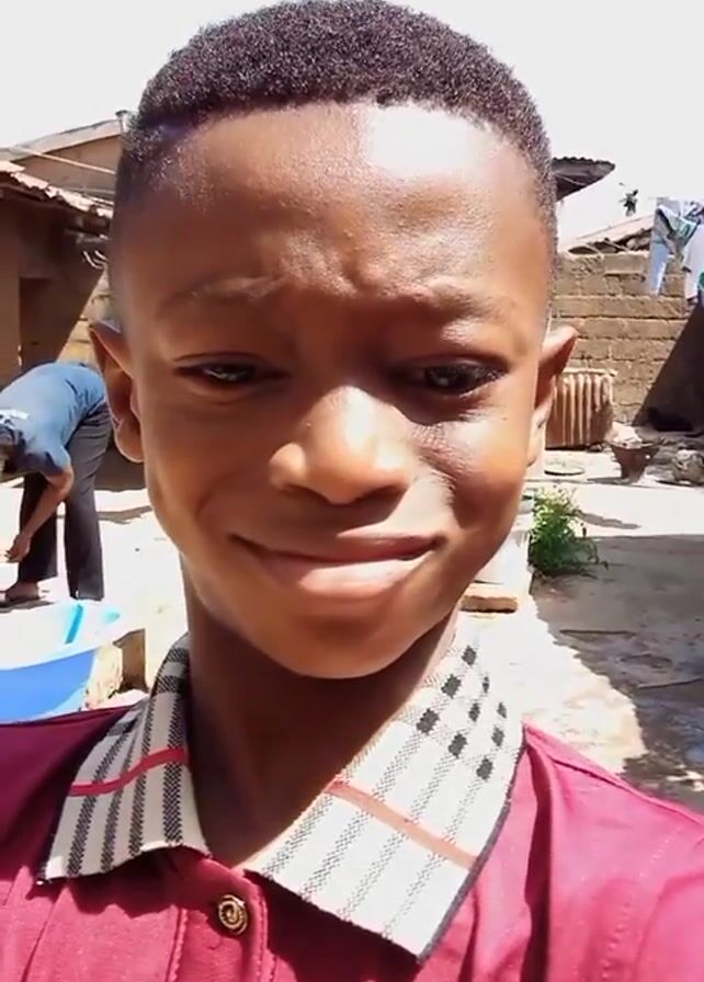 A young man is standing outside, facing the camera with a slight smile. He is wearing a red shirt with a checkered collar. Behind him, another person is bending over a blue container. The setting appears to be a residential area with buildings and some laundry hanging in the background. The lighting is bright, suggesting it is daytime.