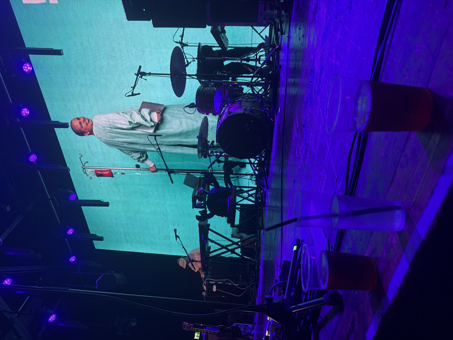 On a stage, a large screen displays an image of a man in white with an IV drip, holding a book. A drum set is visible behind the screen. Musical equipment including a guitar and keyboard, along with microphones and speakers, are positioned on the stage. Two plastic cups containing liquid sit on the stage floor, illuminated by a blue light.