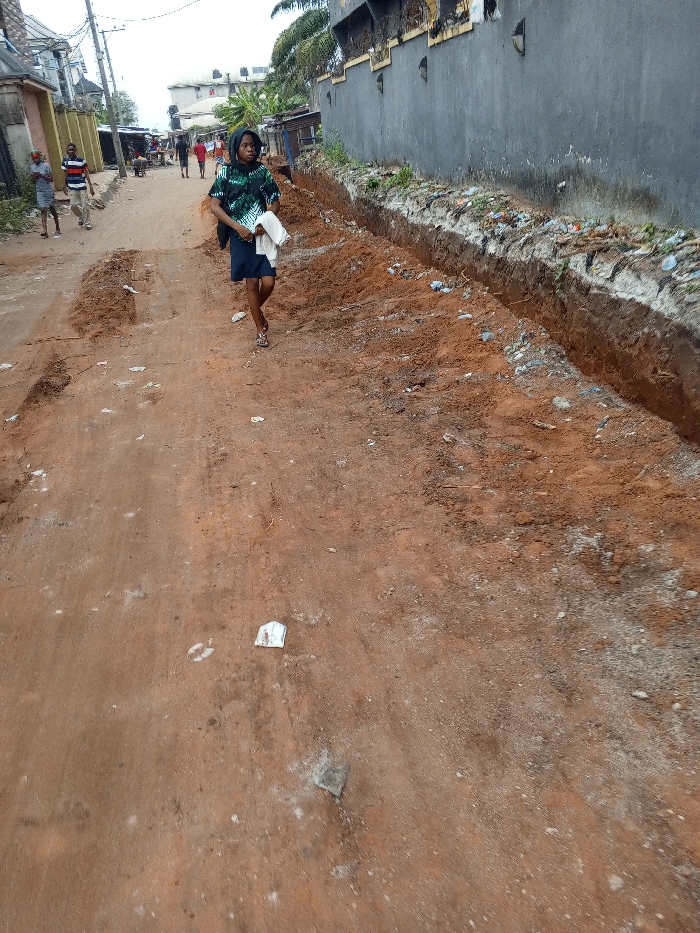 A dirt road has a long trench running alongside it. The trench contains garbage. A woman in a green shirt walks down the road holding a white cloth. Several people walk further down the road in the distance. There are buildings visible and trees on the sides of the street. The sky is overcast.