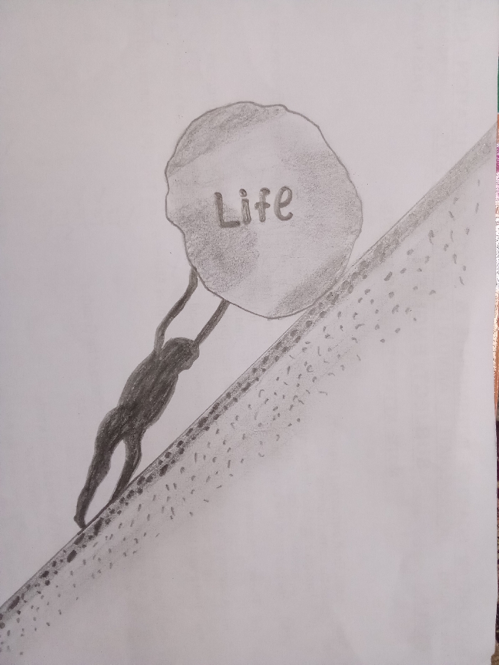 This is a monochromatic pencil drawing on white paper, depicting a stylized scene. A dark, silhouetted humanoid figure is positioned on an upward-sloping incline, pushing a large, irregularly shaped, shaded object. The object bears the word "Life" inscribed in uppercase letters on its visible surface. The figure's two elongated arms extend upwards, bracing against the object, while its legs are angled consistent with an uphill push. The incline is represented by a diagonal line extending from the lower left towards the upper right, with the area beneath this line partially shaded with small, scattered dark markings. The background is unadorned white paper. This drawing is located in Quetta, Pakistan.
