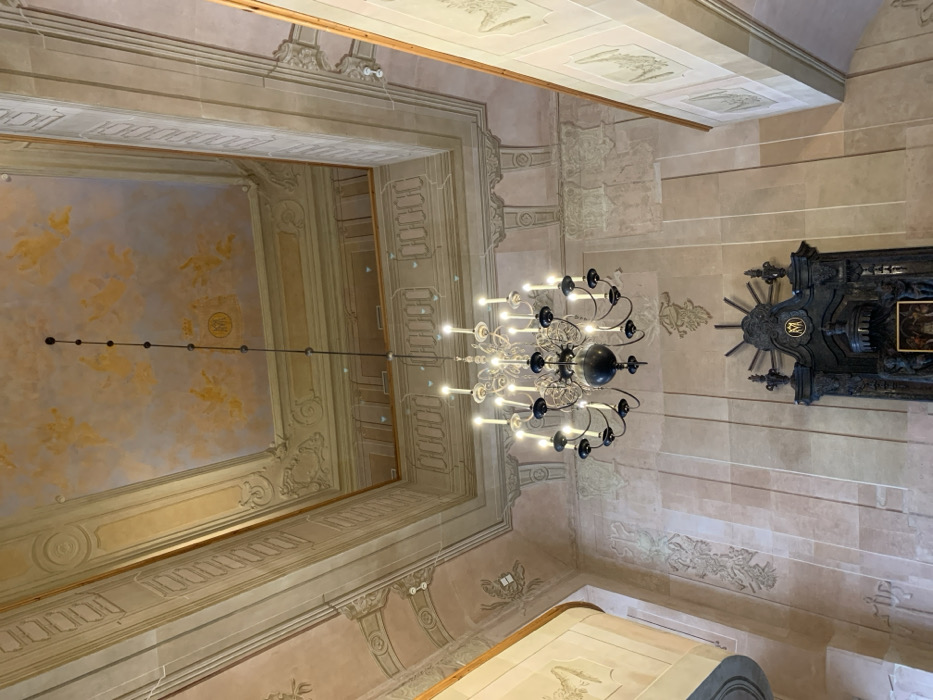 This image depicts the ornate interior of a grand hall or church, likely within the Radziwill Castle complex or a prominent religious building in Nyasvizh, Belarus. The scene is dominated by a high, vaulted ceiling featuring intricate decorative elements. The central, recessed rectangular portion of the ceiling displays a faded fresco in hues of light blue and yellow, depicting stylized cherubic figures and a central circular motif containing a crowned 'M' monogram. Surrounding ceiling sections are adorned with detailed stucco or plasterwork, including classical moldings, geometric patterns, and bas-relief ornamentation in muted beige and pink tones. Suspended centrally from the ceiling by a long, slender black rod with intermittent spherical nodes is a large, multi-tiered chandelier. This chandelier, appearing to be crafted from dark metal, features numerous illuminated candle-shaped electric lights, casting a warm glow. The tall walls below the ceiling are predominantly light pinkish-beige, structured with vertical paneling and embellished with extensive bas-reliefs featuring floral scrolls, fantastical creatures, and classical motifs. Centered at the bottom of the frame is a large, dark, intricately carved wooden or stone structure, appearing to be a reredos or altar. This structure features radiating sunburst elements at its apex, enclosing a circular emblem identical to the crowned 'M' monogram seen on the ceiling. A framed painting or icon is visible within a niche at the base of this structure. Architectural elements include a partial view of a light-colored, curved balcony or gallery on the lower left, and the underside of another overhead balcony or gallery on the right, decorated with framed paneling. No people are present, and no actions or interactions are depicted. The environment is static and richly decorated, suggestive of historical and architectural significance.