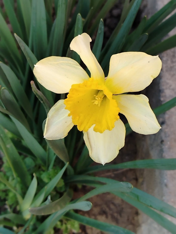 A close-up, top-down view captures a single daffodil (Narcissus) flower in bloom, located in Beshbola, Uzbekistan. The flower displays six distinct, pale yellow petals surrounding a central, deep yellow, ruffled trumpet. Inside the trumpet, light yellow stamens are visible. The flower is situated amidst a dense growth of its own dark green, strap-like leaves. Lighter green foliage is present at the base of the plant on the lower left. The background is out of focus, showing dark earth or soil and a light gray concrete or stone edge along the right perimeter of the frame. No individuals are present.