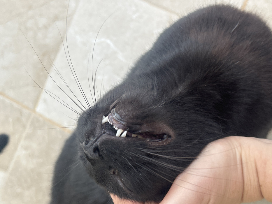 The image depicts a close-up view of a black domestic cat indoors in Karmiel, Israel. The cat is positioned on a light-colored tiled floor, with its head slightly rotated upwards. A human hand, light-skinned with visible knuckles and creases, is observed supporting or interacting with the cat's chin and jaw area. The cat's mouth is open wide, revealing sharp white canine teeth, smaller incisors, and the dark pink interior of its mouth. Long, prominent black whiskers extend outwards from its muzzle. The cat's eyes are partially closed. The background consists of off-white or beige square floor tiles with visible grout lines. An out-of-focus dark object is present in the upper-right portion of the background.