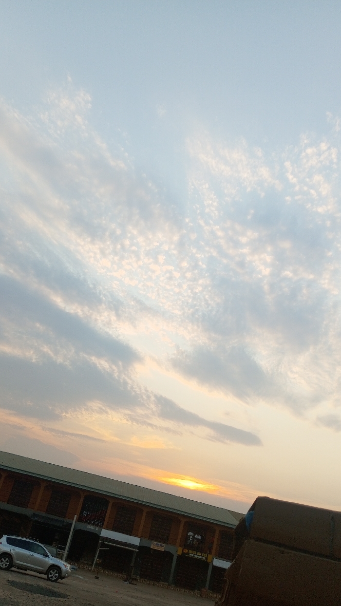 A low-angle shot captures a building bathed in the warm glow of a setting sun. The sky is filled with delicate clouds, exhibiting hues of blue and orange. A silver SUV is parked near the building, while a stack of cartons sits to the right, partially obstructing the view. The overall image presents a serene and picturesque scene, likely taken during the late afternoon or early evening.