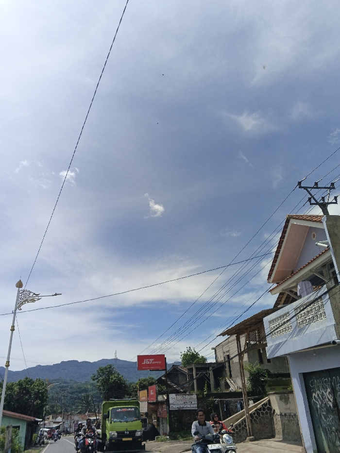 A daytime view of a street in a rural area showcases a mix of activity. A green truck and several motorcycles are on the road. Buildings line the street, one displaying a J&T Express sign. Power lines crisscross the sky, which is mostly clear with scattered clouds. A mountain range is visible in the distance.