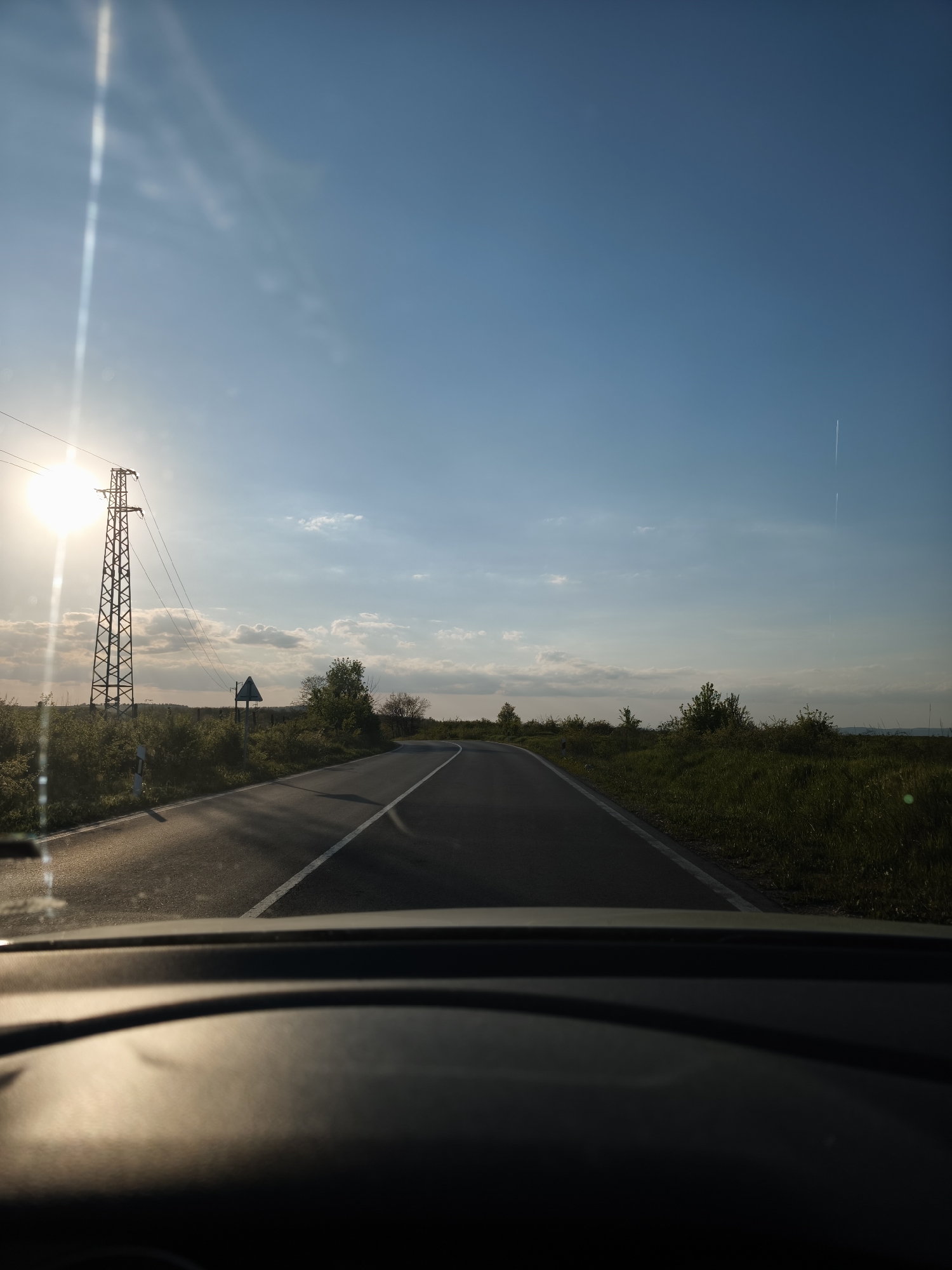 View from inside a vehicle driving on an asphalt road in Benkovski, Bulgaria. The road curves slightly to the right, with a white line marking the edge. Vegetation lines both sides of the road. A power line tower is visible on the left, with the sun positioned behind it. The sky is blue with light clouds. A thin contrail is visible in the upper right portion of the sky. The vehicle's dashboard is visible in the foreground.