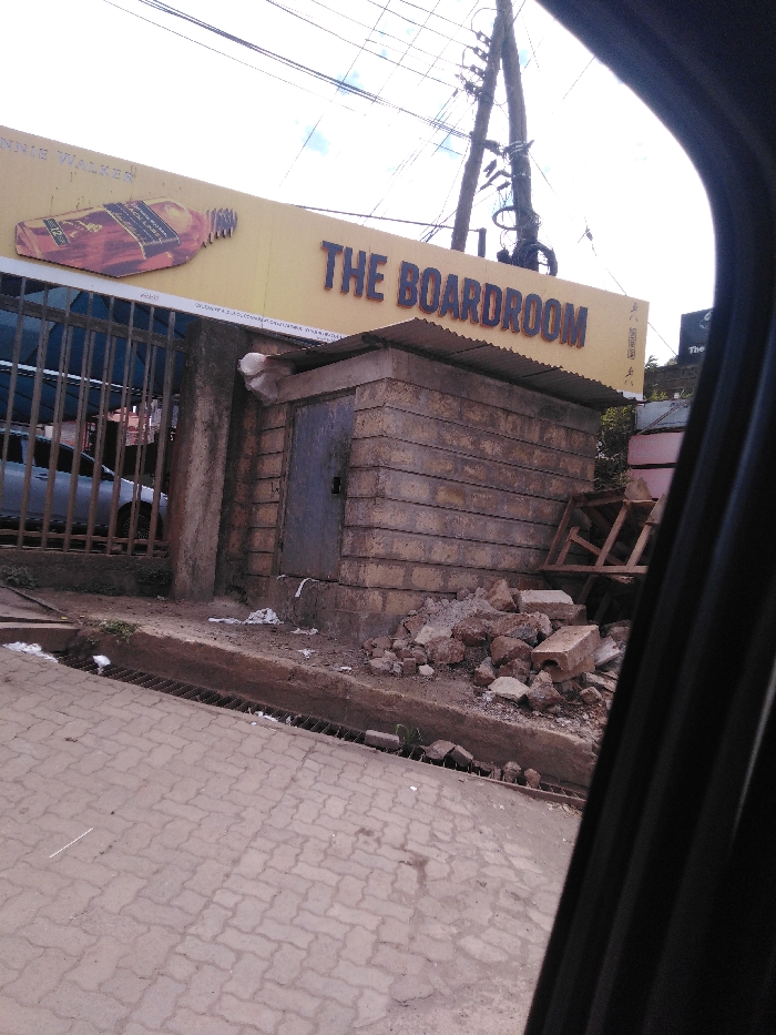 An outdoor, daytime image taken from a vehicle depicts a commercial establishment identified by a large yellow sign reading "THE BOARDROOM" in dark blue lettering. To the left of this text, a prominent advertisement for "JOHNNIE WALKER" whiskey, featuring a depiction of a Red Label 12-year-old bottle, is visible on the same sign. Below the main sign, a small, single-story utility structure constructed from stacked rectangular concrete blocks with a corrugated metal roof and a dark metal door stands on the right side of the frame. Adjacent to this structure on the right, a pile of assorted construction debris, including broken concrete blocks and dirt, is visible. Further right, partially obscured, are pieces of wooden framework. To the left of the block structure, a dark metal gate partially reveals a paved area where a light-colored sedan is parked under a blue shade canopy. The foreground features a concrete paver sidewalk or parking area, separated by a curb from a dirt strip containing a metal-grated storm drain. Overhead, numerous power lines crisscross against a cloudy sky, with a wooden utility pole supporting transformers and wires visible behind the main signage. No individuals are present, and no actions or interactions are depicted. This scene is located in Kikuyu Township ward, Kenya.