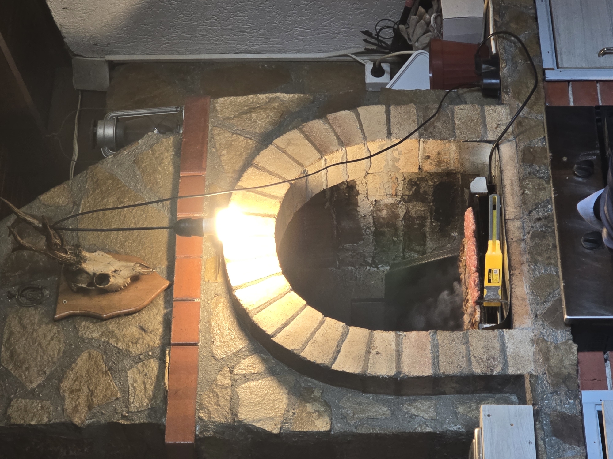 stone and brick indoor barbecue structure. It features an arched opening with a bright light inside, possibly indicating an active fire. A mounted animal skull on a wooden plaque decorates the left side of the barbecue. There's a yellow tool or device inserted inside the barbecue opening, possibly for measuring temperature or some other cooking-related parameter. The structure is built into a wall with other fixtures and equipment visible above it, suggesting a kitchen or cooking area indoors. The location cannot be identified as Burgas, Bulgaria based on the image alone.