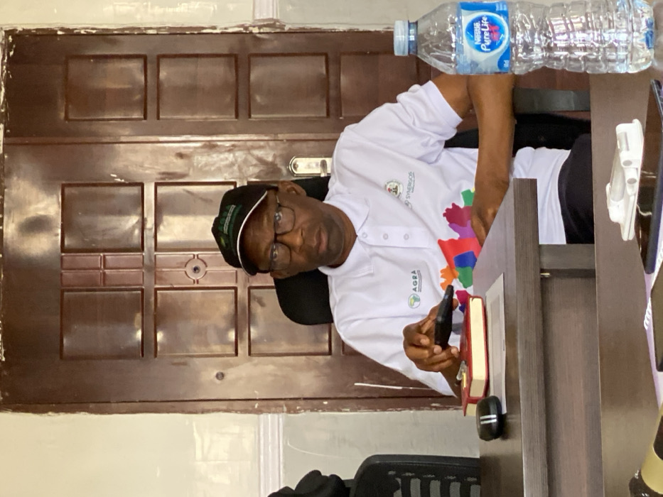 This image, taken in Unguwar Rimi, Nigeria, displays an adult male seated at a dark brown wooden desk within an indoor setting