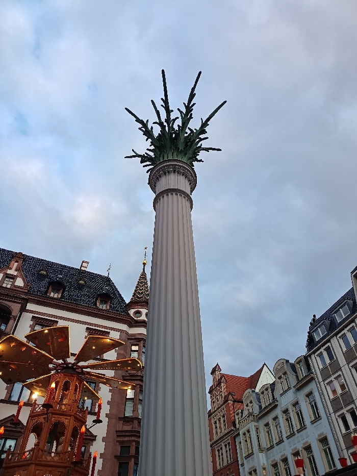 The image presents a low-angle perspective of the Friedenssäule (Peace Column) on the Markt (Market Square) in Leipzig, Germany